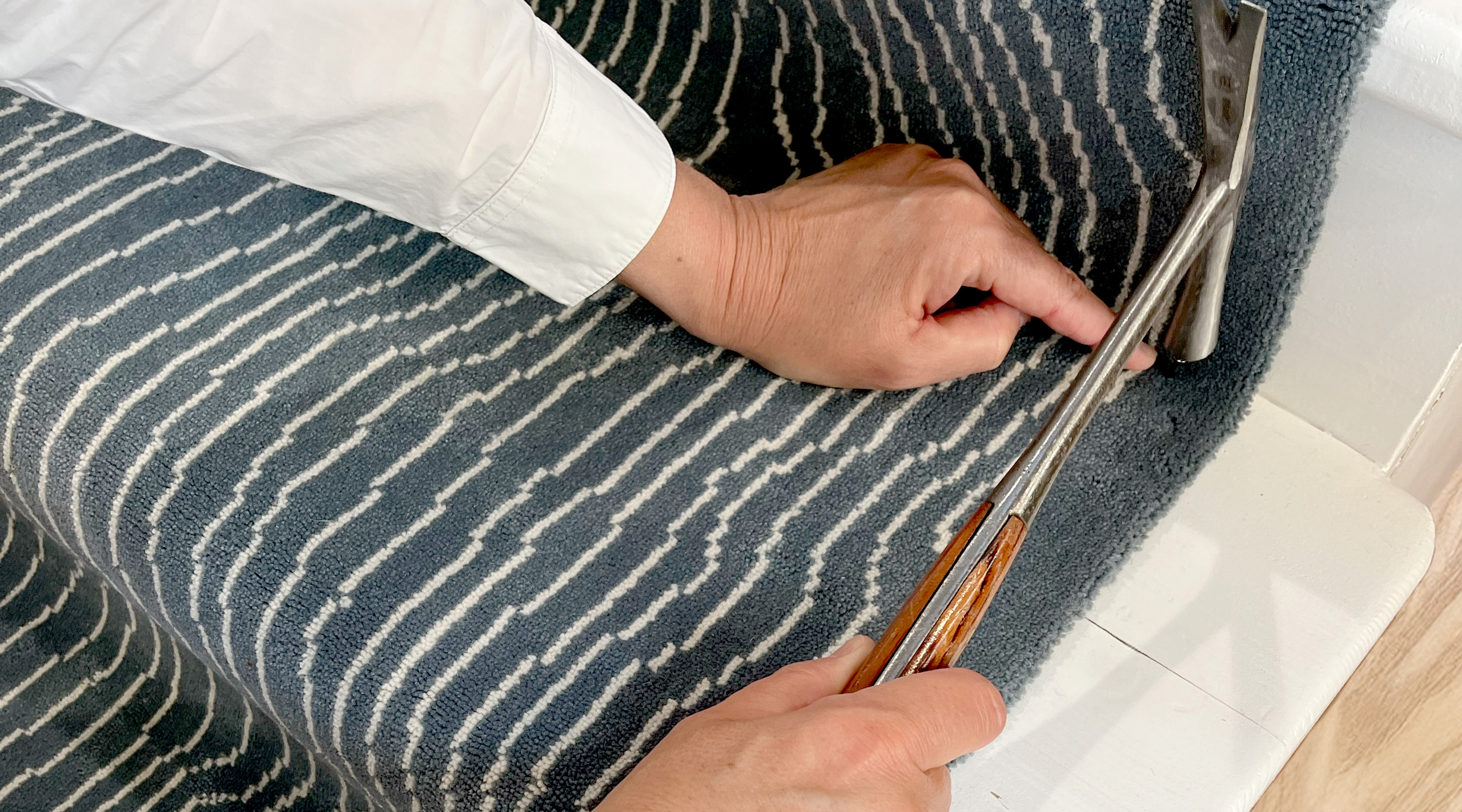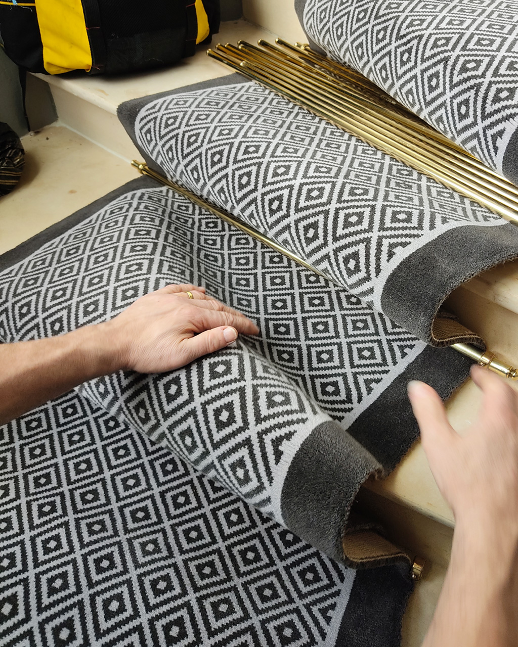 Dans un escalier en pierre, le poseur effectue une pince (cousue à l’aiguille) dont l’épaisseur va se coincer contre la tringle et permettre la tension du tapis.