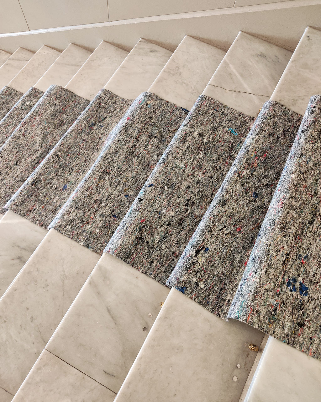 On laisse des réserves sous les traverses palières afin de pouvoir le déposer, le nettoyer et le reposer en le décalant légèrement. De cette façon, nous déplaçons les marques laissées par le passage intensif sur les nez de marches, et le tapis peut durer plus de 20ans, à condition d’un entretien régulier.