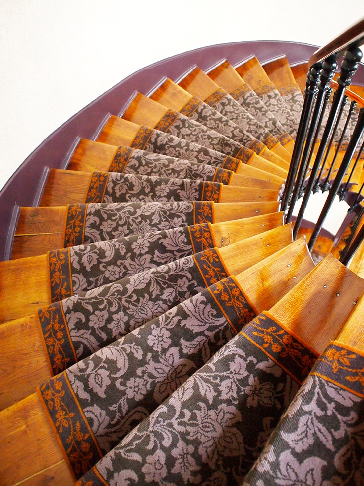 Ce tapis jacquard 2 grils, 4 couleurs était un choix audacieux. Il se marie très bien avec le doré des marches et portes en bois clair.